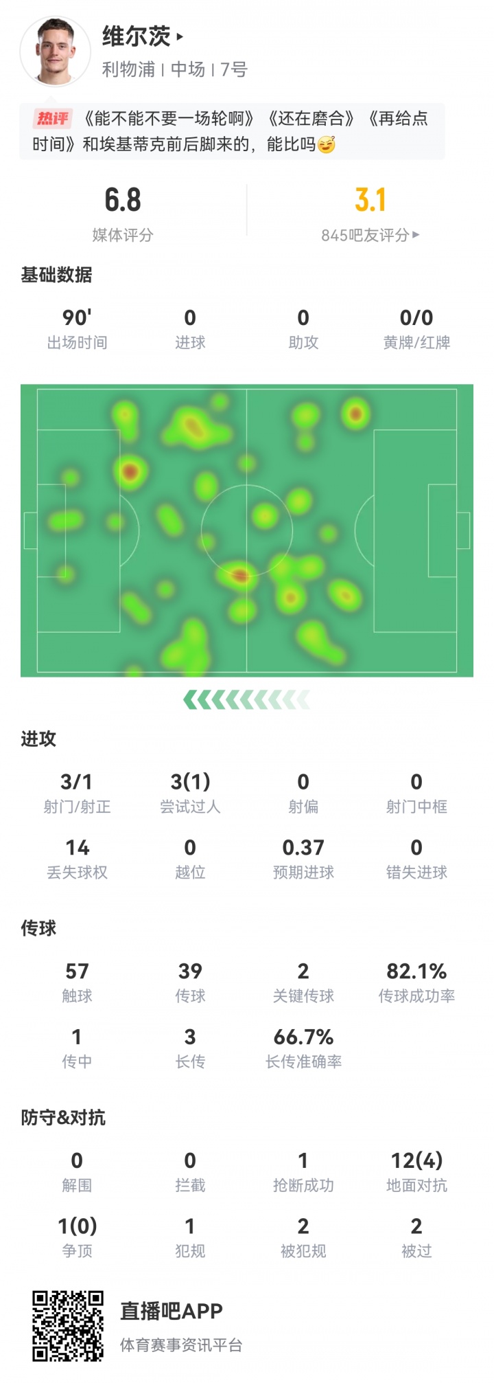 维尔茨未能展现出任何尖锐度。这位德国国脚14次丢失球权,13次抗争仅赢下4次(得手率31%)。下半场一次传球伪善后,他双手掩面——信心显着已碰到重挫。