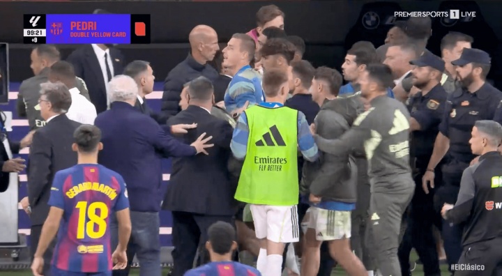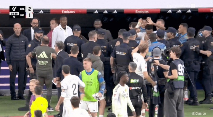 10月27日讯 西班牙国度德比皇马2-1打败巴萨,TA发文梳理本场比赛终末阶段的一系列乱象,由于球员情感失控,窥察露面骚动才将球员分开。