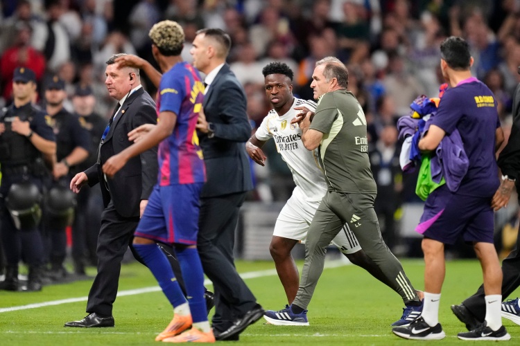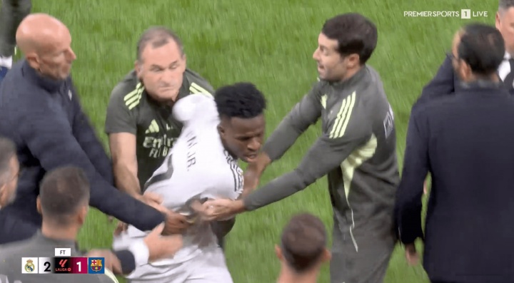 亚马尔走近场边时,维尼修斯走过来对他作念了“话太多”的手势,两东说念主发生争吵。皇马门将讲明略比斯试图将维尼修斯拖回球员通说念,但这位巴西东说念主启动冲向亚马尔,被皇马四名使命主说念主员拦住。拉菲尼亚跑向国度队队友维尼修斯,被皇马的巴尔韦德实时制止。