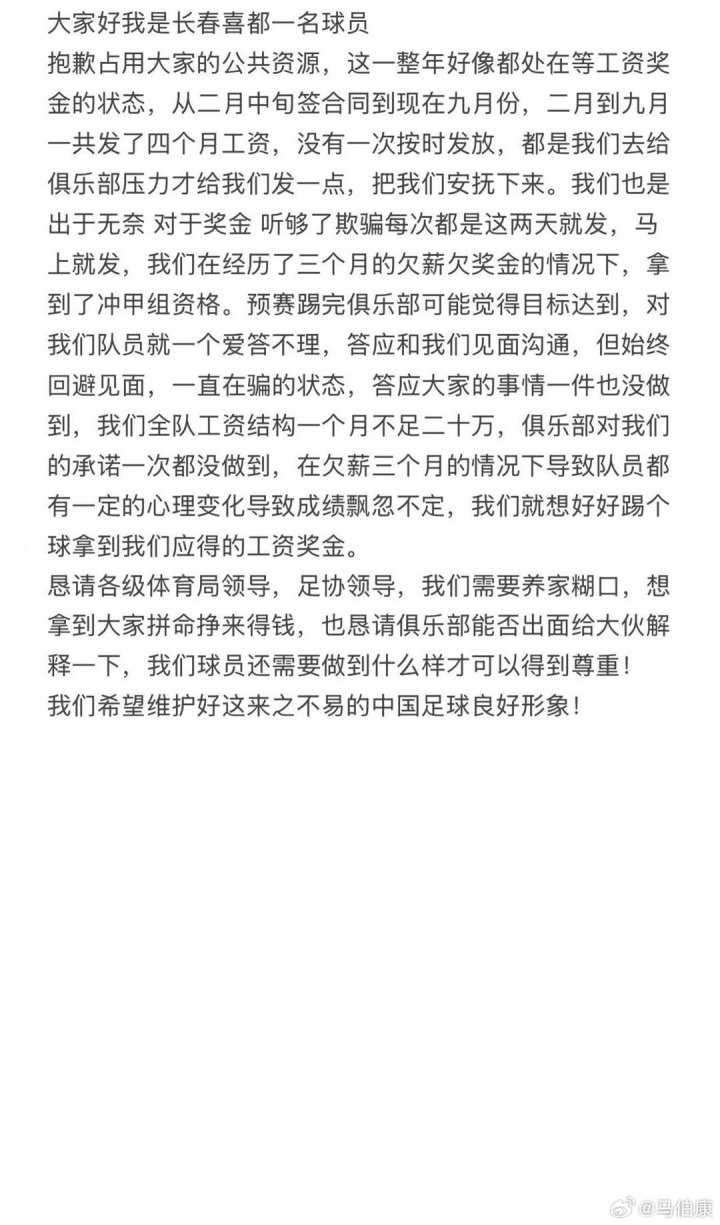 09月09日讯 中乙长春喜齐球员马伯康在社媒发文讨薪,他示意本年签署协议后后8个月仅发了4个月工资,且奖金也一直拖欠。