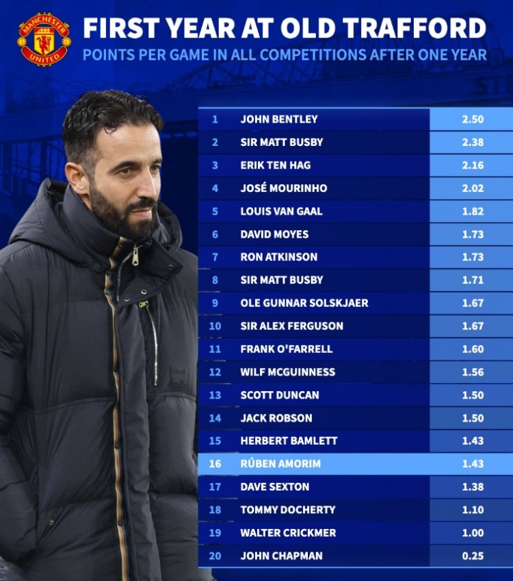 曼联主帅抓教首年场均拿分榜:滕帅、穆帅列三四,阿莫林第16