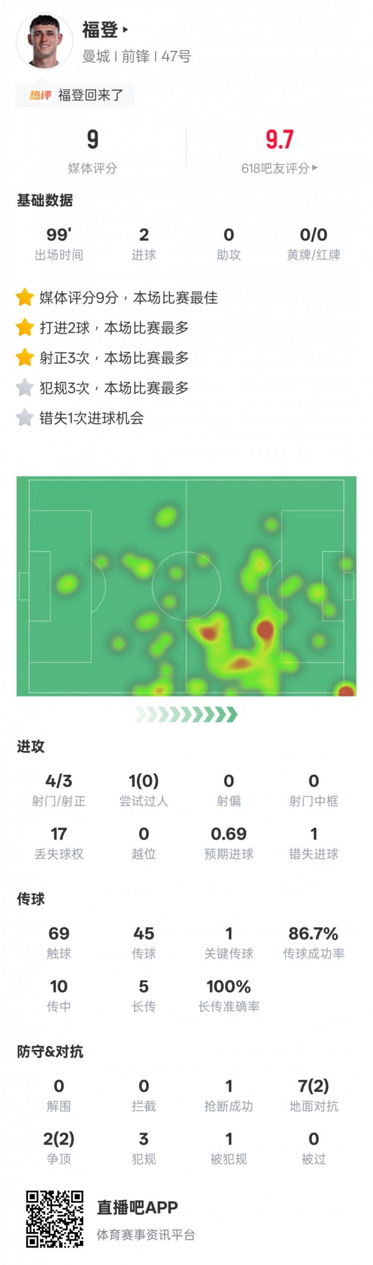 福登本场数据:2进球1枢纽传球+错失1进球契机,评分9.0全场最高