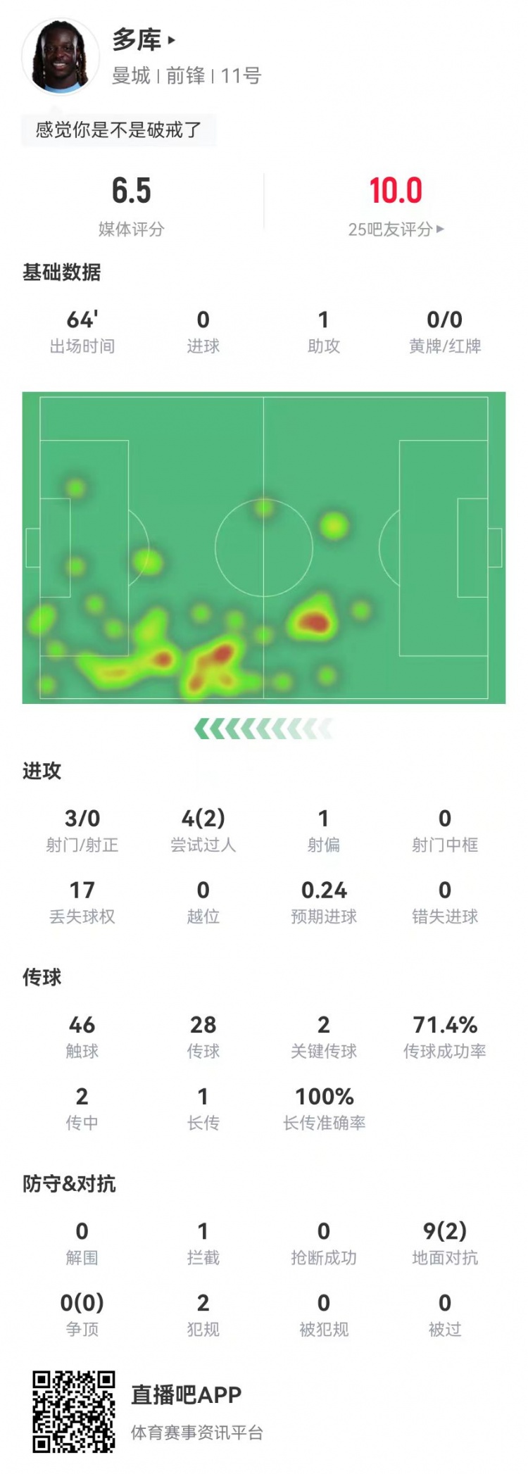12月3日讯 曼城在本轮英超客战富勒姆,多库进球被改当作乌龙。他本场数据如下: