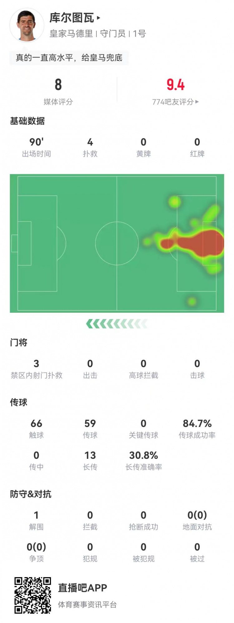 库尔图瓦本场数据:4次扑救+1突围 13次长传4次顺利 获评8分