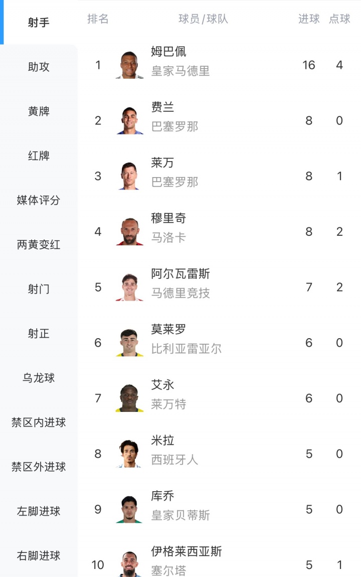 姆巴佩以16球领跑西甲弓手榜,费兰、莱万和穆里奇均8球,阿尔瓦雷斯7球。