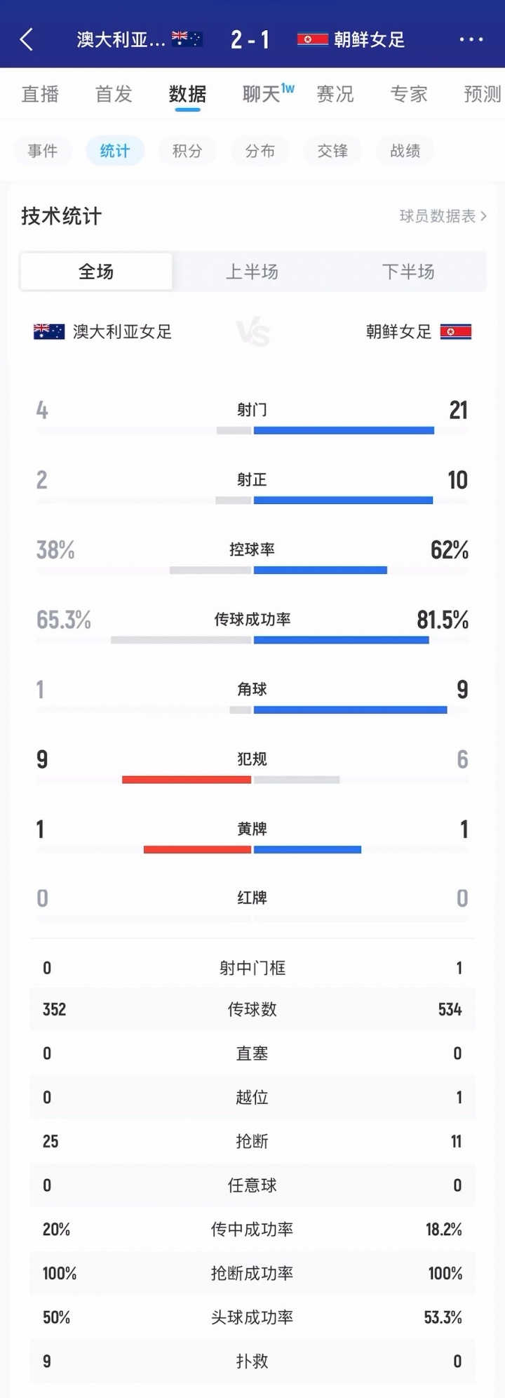 系统局!澳女足2-1朝鲜女足数据:朝鲜狂轰21脚,袋鼠2射门命中进2球
