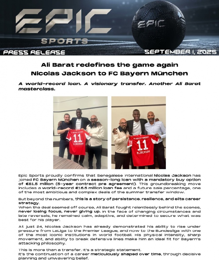 9月2日讯 杰克逊牙东谈主巴拉特的经纪公司EPIC SPORTS发文,狂赞杰克逊转会拜仁的走动。