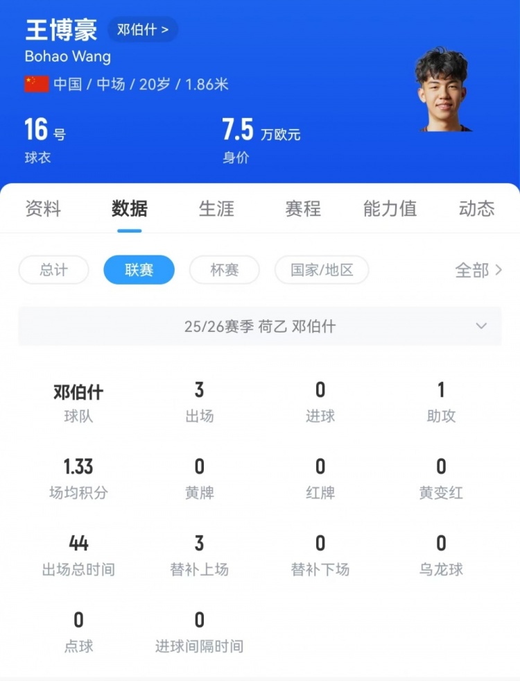 王博豪出身于2005年7月,本年20岁,身高1米86,踢中场位置。本赛季从陕西荟萃租赁到荷乙球队邓伯什,出场3次,均是替补出场,送出1次助攻。