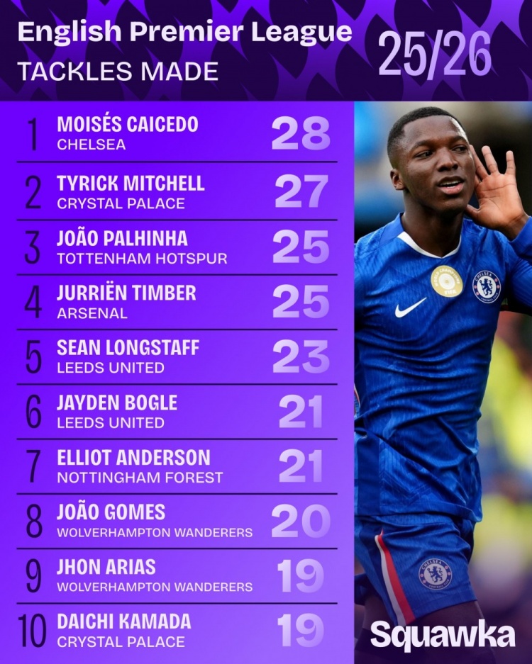 10月7日讯 Squawka统计了本赛季英超抢断榜前十,切尔西中场凯塞多28次位居第一,阿森纳后卫廷伯25瓜代四。