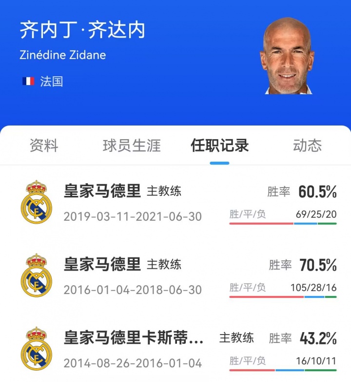王人达内2021年再度卸任皇马主帅一职后便一直失业,他曾辅导皇马得回欧冠冠军、西甲冠军等多项荣誉。