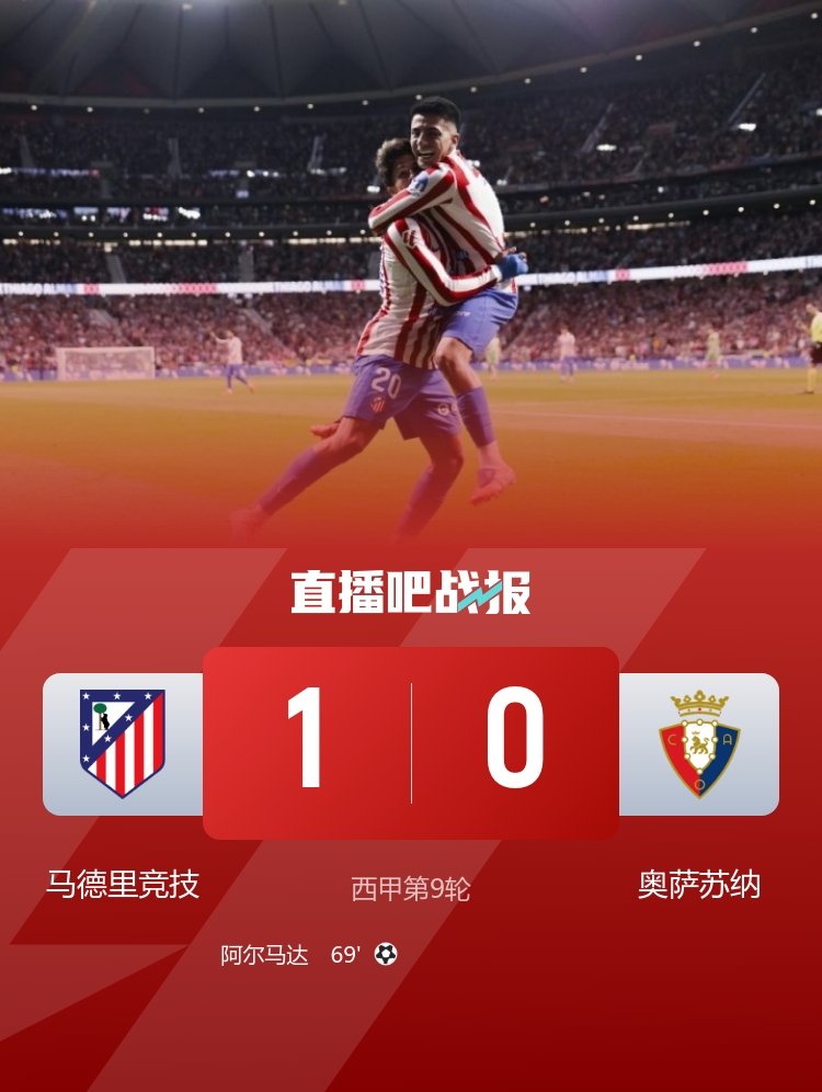 西甲第9轮,阿尔马达制胜,马德里竞技1-0奥萨苏纳。
