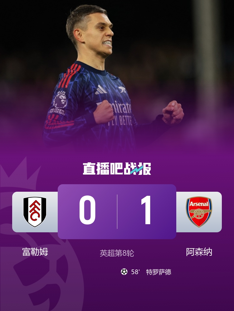 英超联赛第8轮,阿森纳1-0小胜富勒姆,特罗萨德制胜。