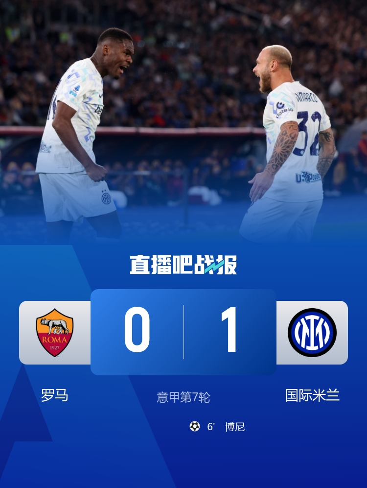 意甲第7轮,国外米兰1-0客胜罗马,博尼制胜。