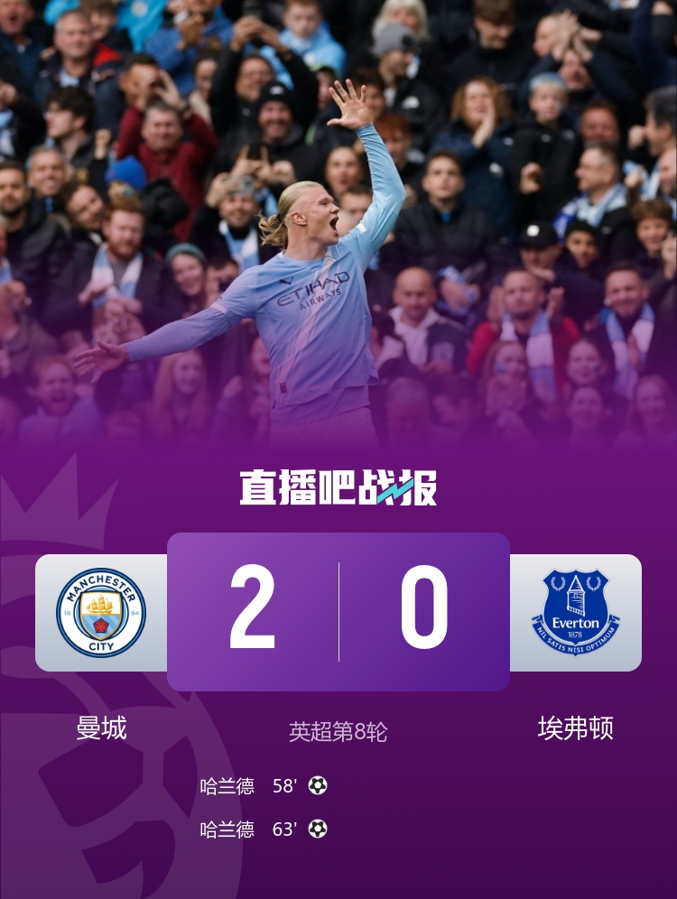 英超联赛第8轮,曼城2-0战胜埃弗顿,哈兰德梅开二度,福登贪图两球。