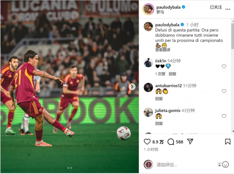 迪巴拉社媒晒出比赛相片,并写谈:“对这场比赛感到失望,但此刻咱们必须合作一致,为下一场联赛作念好准备。”