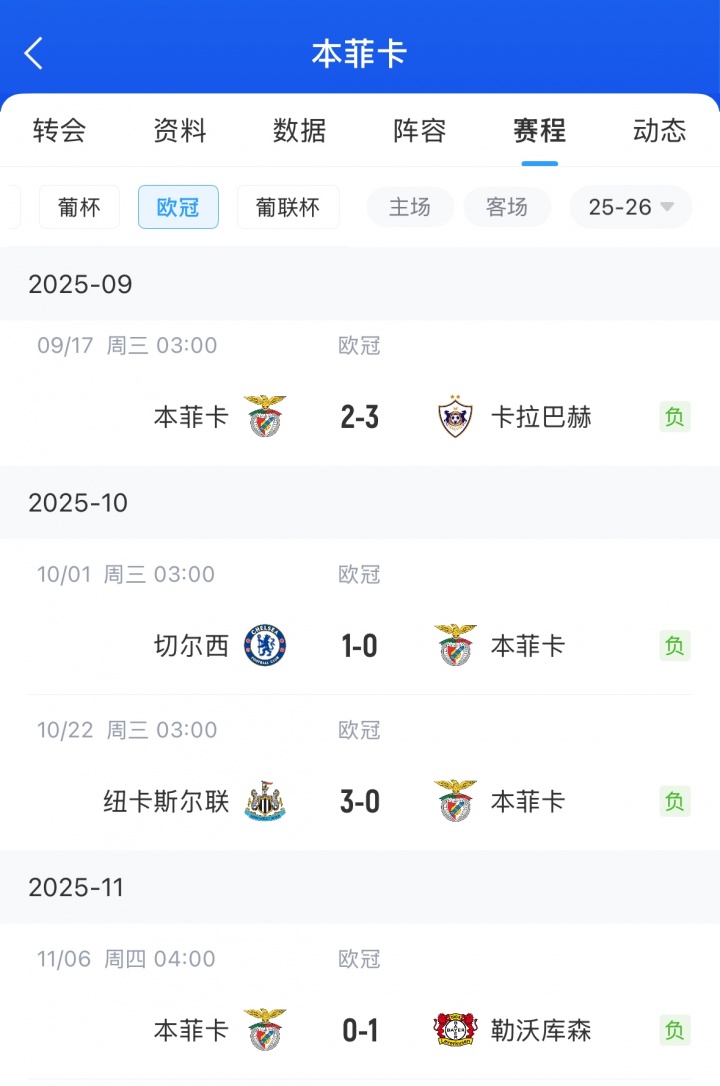 本菲卡四连败:2-3卡拉巴赫、0-1切尔西、0-3纽卡、0-1勒沃库森