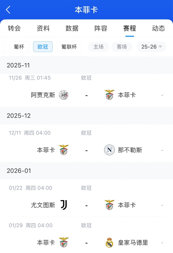 接下来欧冠四场,本菲卡还将濒临包括那不勒斯、尤文及皇马。只须阿贾克斯与本菲卡处境肖似,两队王人四连败。