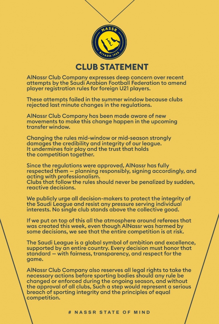 利雅得凯旋官方声明:反对沙特足协赛季中期修改U21外助章程