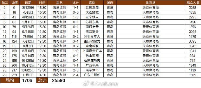 2025中甲联赛青岛红狮队现场不雅世东说念主数统计:共计25590东说念主次,场均1706东说念主。