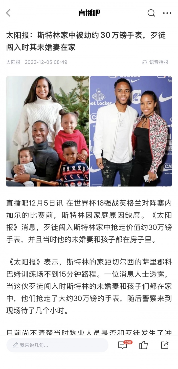 2022年12月卡塔尔寰球杯技术,斯特林因家庭住宅遭劫片刻离开英格兰队驻地,随后在四分之一决赛前归队。