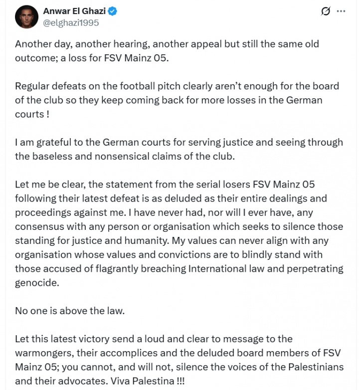 11月13日讯 因复旧巴勒斯坦而遭好意思因茨失当解约的埃尔加王人当天发布社媒,宣告我方对好意思因茨的讼事再度胜诉。