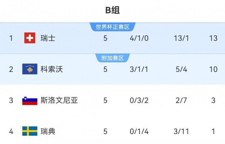 11月16日讯 世初赛欧洲区,瑞典1-4不敌瑞士,五轮仅积1分名次垫底。