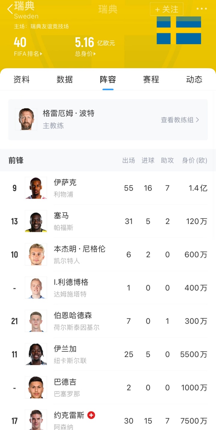 瑞典队声势总身价高达5.16亿欧,领有伊萨克、约克雷斯、伊兰加等球星,但世初赛一胜难求,1平4负仅积1分,只进了3球却丢了11球。托马森上月因厄运战绩下课,波特接办后首秀却1-4惨败。