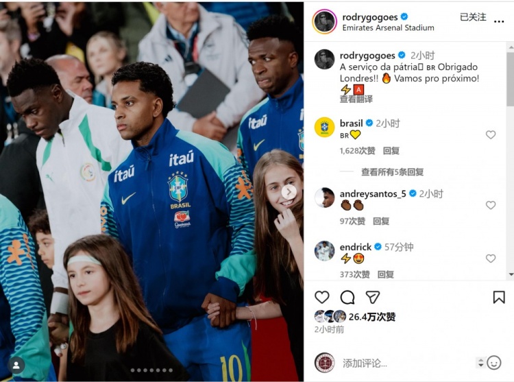 此役罗德里戈为巴西队首发出战,定位球助攻卡塞米罗破门,赛后罗德里戈社媒晒照庆祝得胜,配文:“为国出战,感谢伦敦!专注于下一场比赛!”