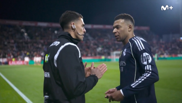 12月02日讯 西甲第14轮皇马客场1-1战平赫罗纳,比赛中Movistar的镜头捕捉到了姆巴佩与场边第四官员亚历杭德罗·克莱门特的一次言语冲破。