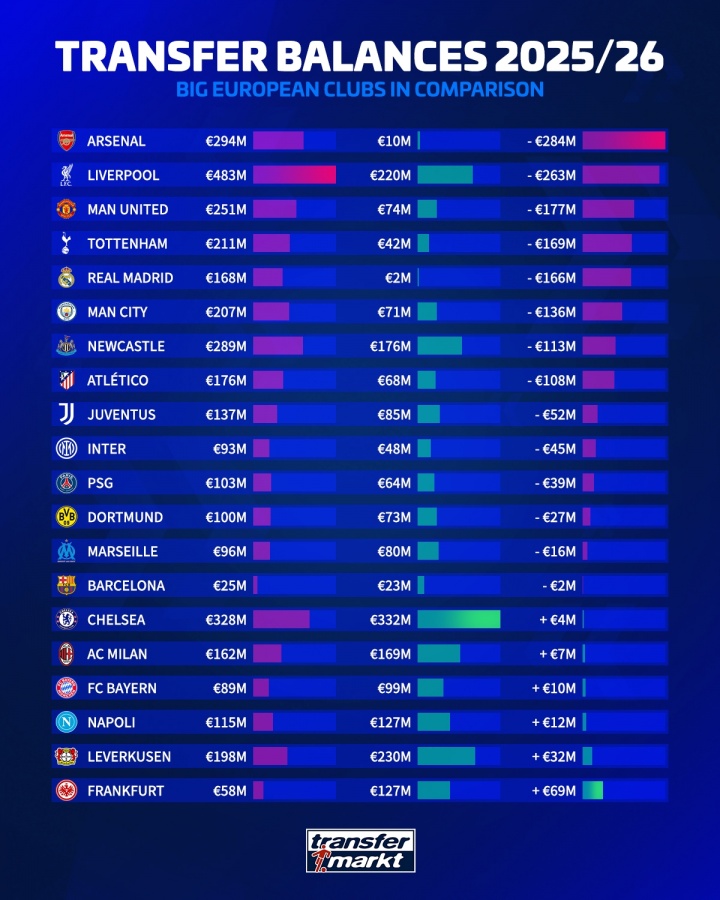 09月05日讯 德转统计了大俱乐部的夏窗净参预名次,枪手2.84亿居首,赤军第2,曼联第3。