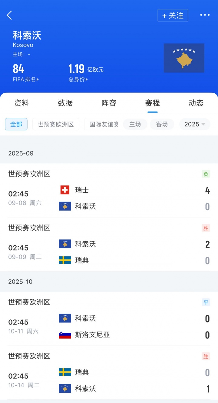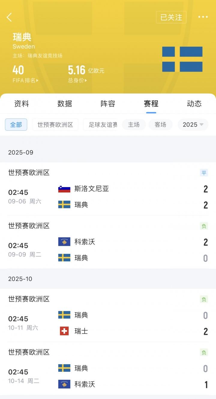 9月世初赛,瑞典2-2斯洛文尼亚、0-2科索沃,名次从寰宇第29跌至第32;10月世初赛,瑞典0-2瑞士、0-1科索沃,名次又从寰宇第32跌至第40。当今,瑞典活着欧预B组名次垫底。