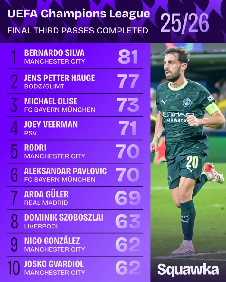 本赛季欧冠完成进攻三区传球榜:B席81挨次一,曼城4东谈主上榜