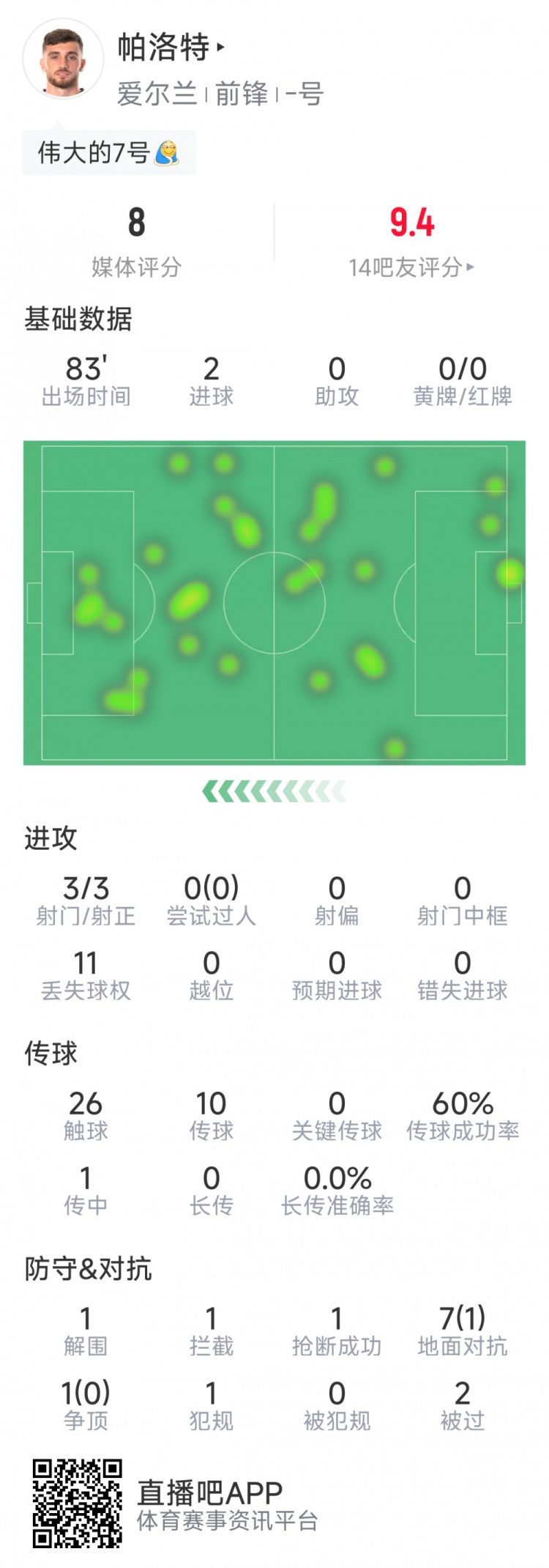 帕洛特聚合两场梅开二度,是爱尔兰队史第四位作念到的球员