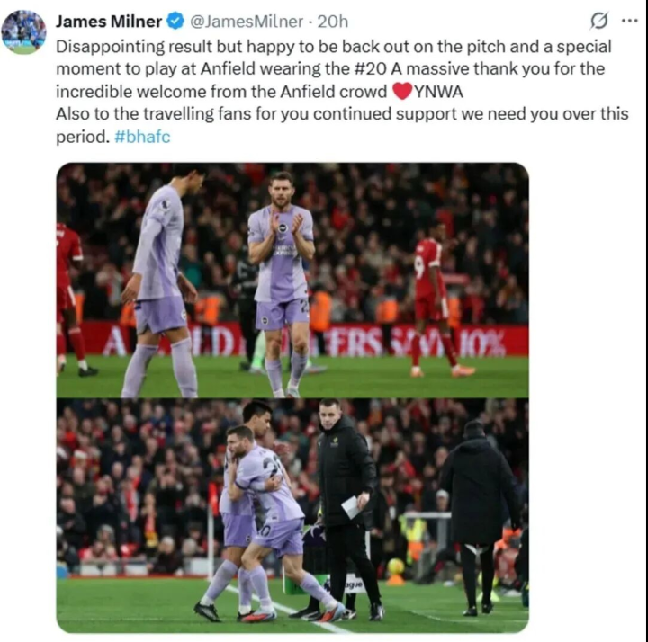 安菲尔德的看台,从不惜惜给传说的掌声。 当米尔纳身着布莱顿球衣踏入这片熟练的红色海洋时,雷鸣般的容许响彻球场——这是他自十月碰到伤病以来的初度登场,更是一段对于致意与传承的关注故事。 此役布莱顿未能带走到手,利物浦时尚埃基蒂克的梅开二度,为赤军锁定了6分大战的胜局。但比分除外,米尔纳的亮相才是这场比赛的关注注脚。 赛后谈及这场故我之行,米尔纳的语言里尽是感触:“效果天然令东谈主失望,但能再行踏上赛场,尤其是身披20号球衣站在安菲尔德,对我而言真谛不凡。”