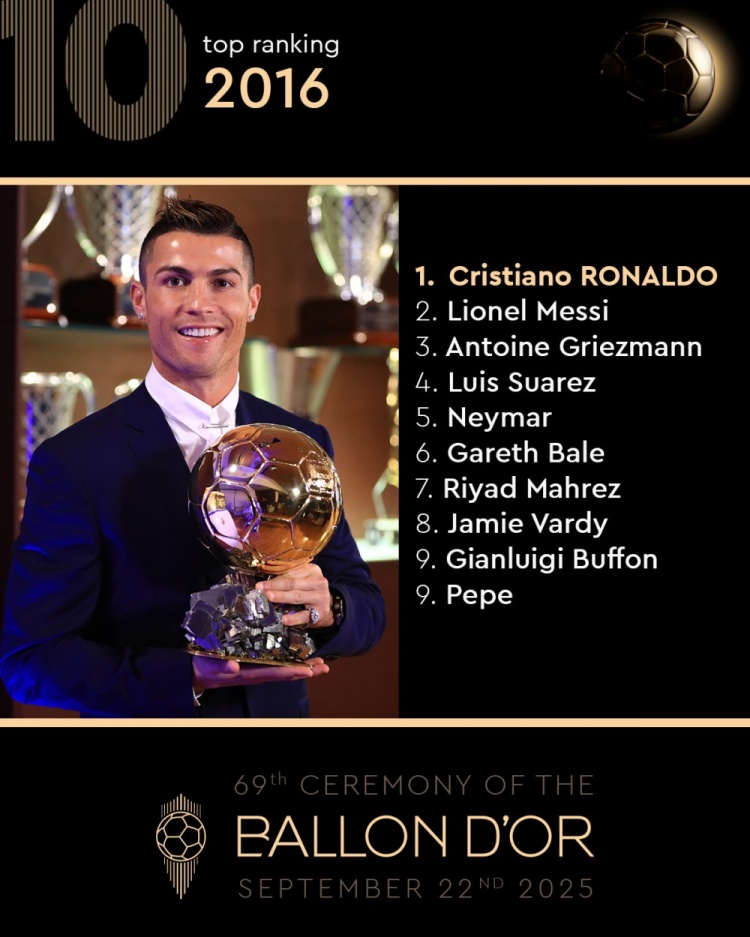 金球奖官方追想2016年前十名:C罗夺魁,梅西、格列兹曼二三位