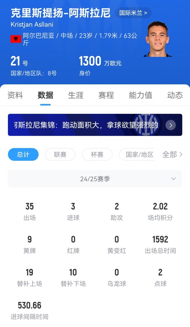 阿斯拉尼现年23岁,司职中场。国米在2023年以1570万签下阿斯拉尼,着力球队于今,阿斯拉尼出场99次,孝敬4球5助,当今球员德回身价为1300万欧元。