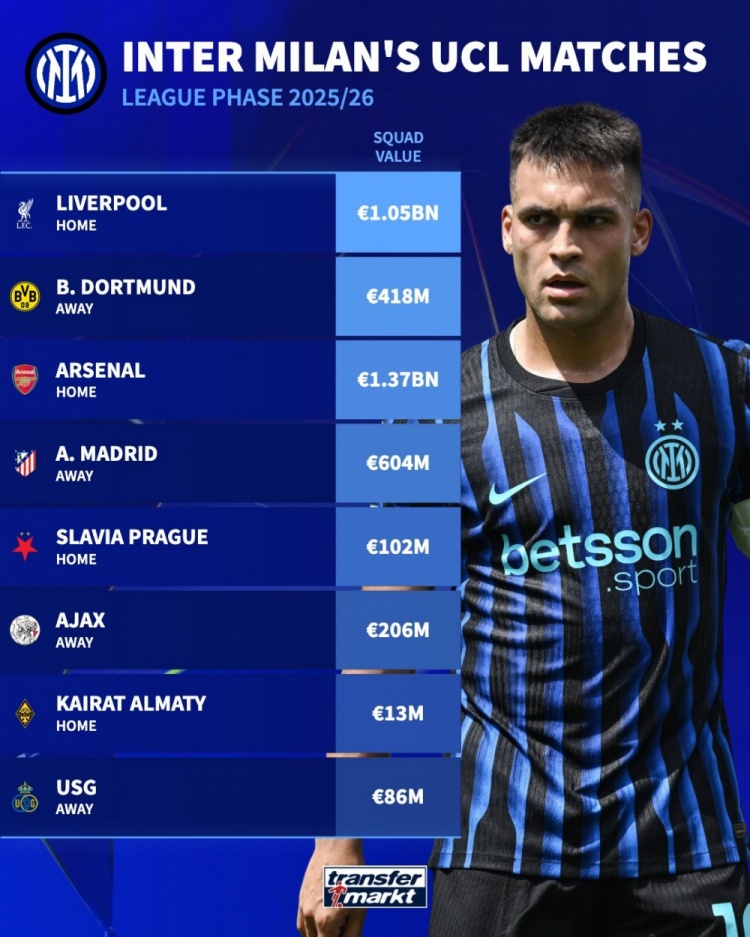 8月29日讯 本赛季欧冠联赛阶段对阵抽签效果出炉,德国转会市集盘货了国米敌手的身价。