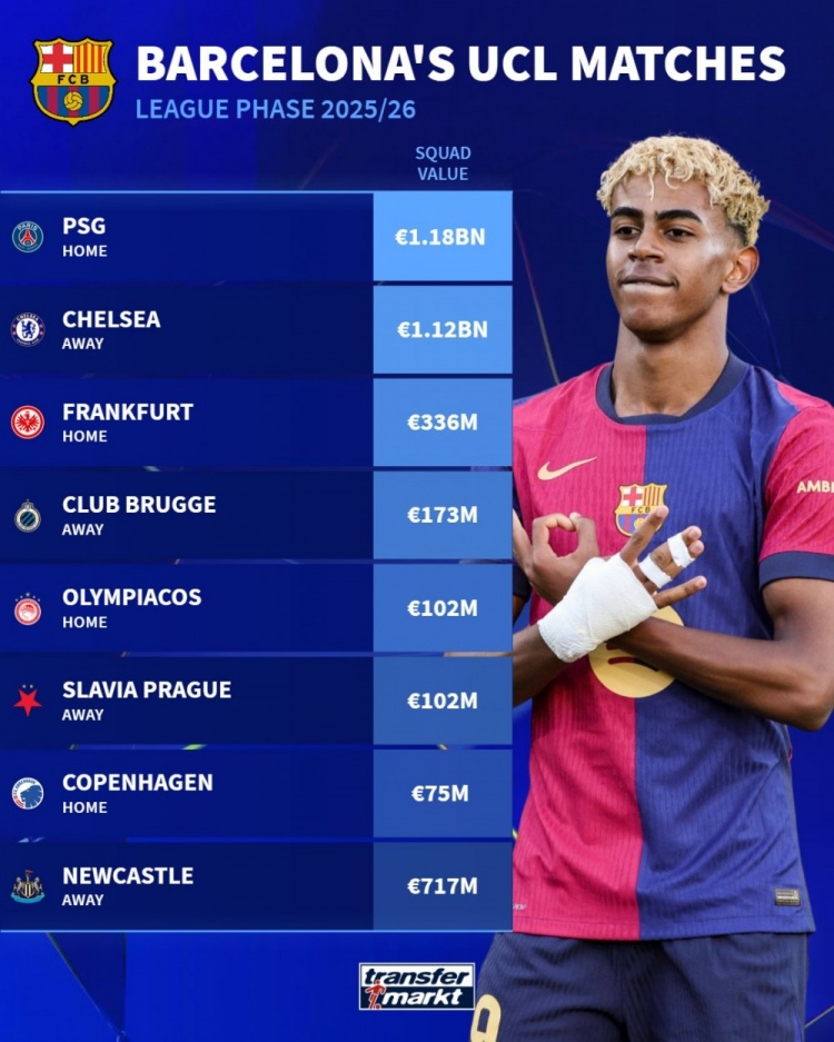 巴萨欧冠敌手身价:巴黎11.8亿欧最高,切尔西11.2亿&纽卡7.17亿