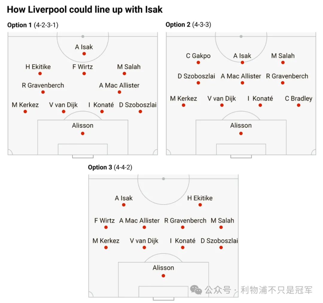 如今他有契机排出4-2-3-1阵型:萨拉赫、维尔茨和埃基蒂克在伊萨克死后接应,后者将身披9号战袍;亦可礼聘4-3-3体系,由萨拉赫、伊萨克和加克波构成锋线三叉戟,中场则沿用上赛季的赫拉芬贝赫、麦卡利斯特和索博斯洛伊组合。