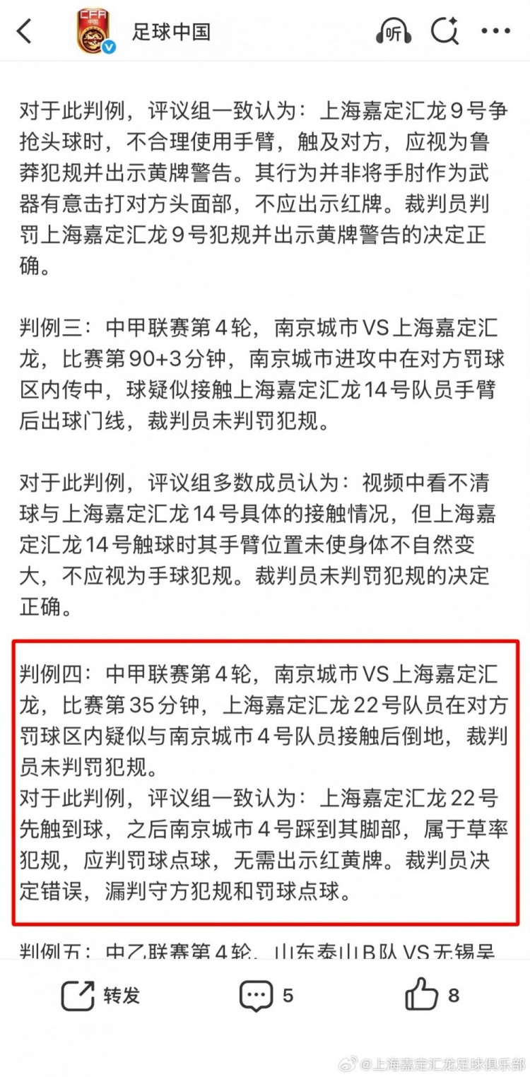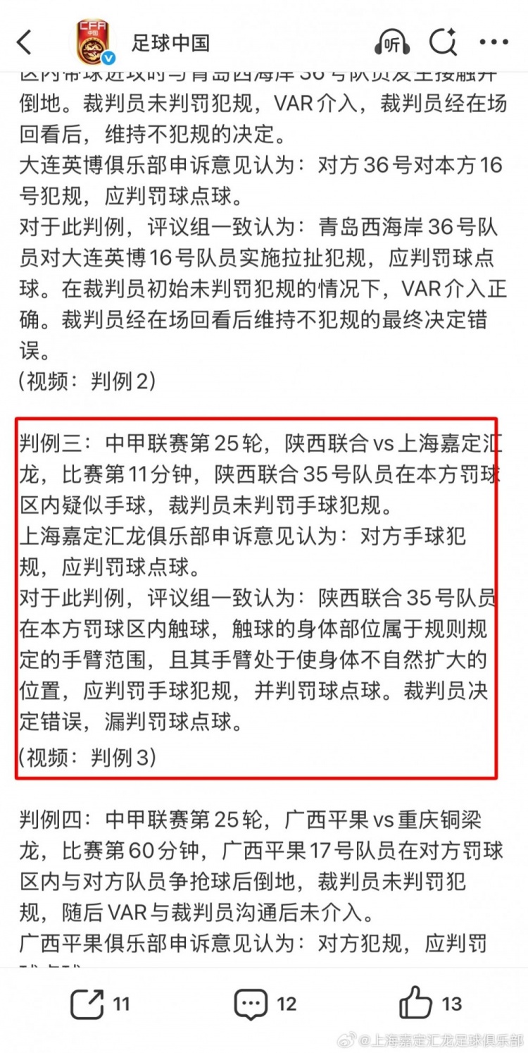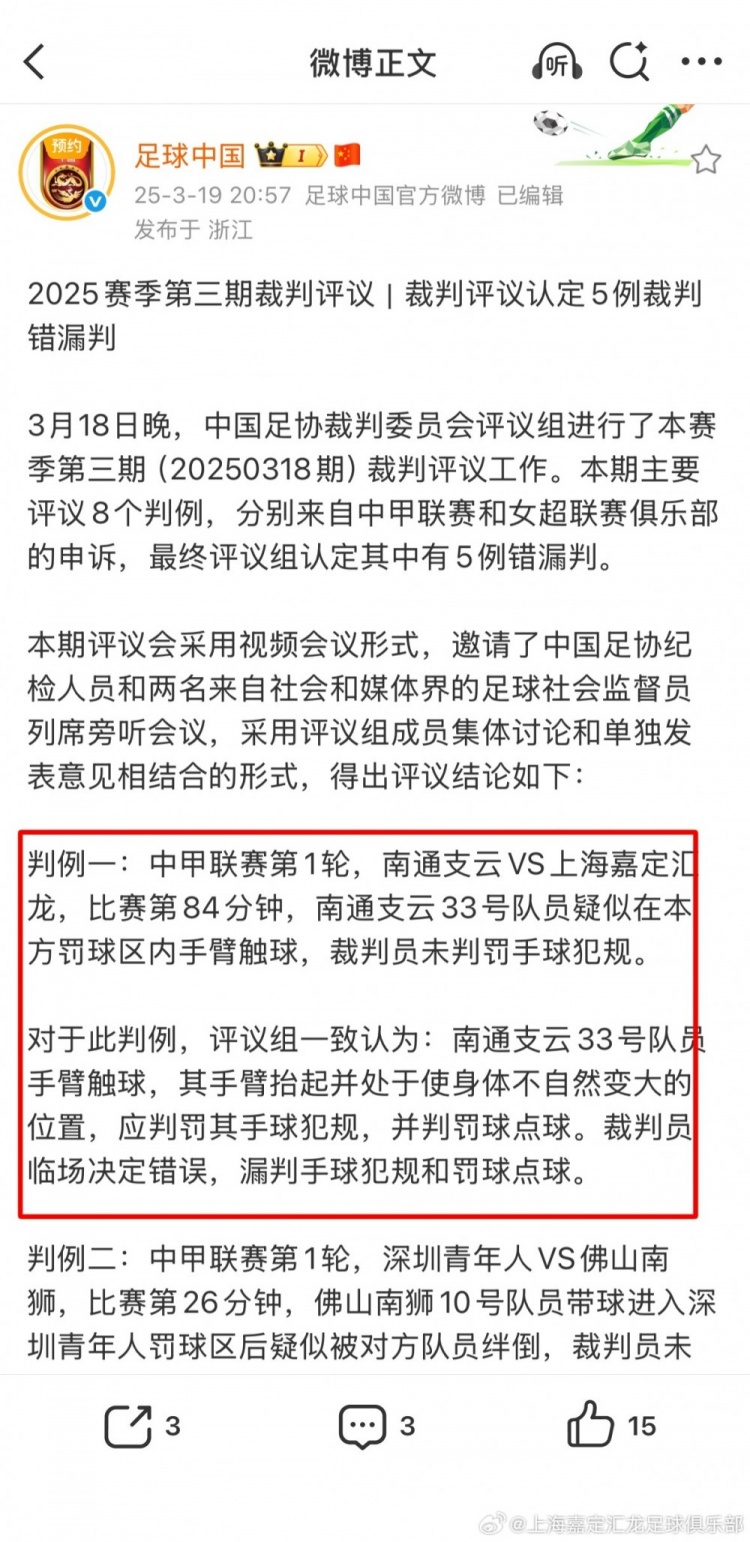 嘉定汇龙官方:司法上轮,足协评议共三次漏判给本队点球