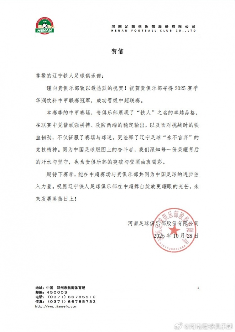 河南俱乐部道贺辽宁铁东说念主夺得2025赛季中甲冠军,生效晋级中超联赛