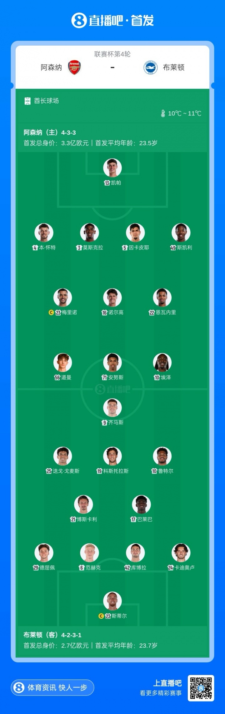 阿森纳首发:13-凯帕、4-本·怀特、3-莫斯克拉、5-因卡皮耶、49-斯凯利、16-诺尔高、23-梅里诺、22-恩瓦内里、56-说念曼、10-埃泽、71-安努斯