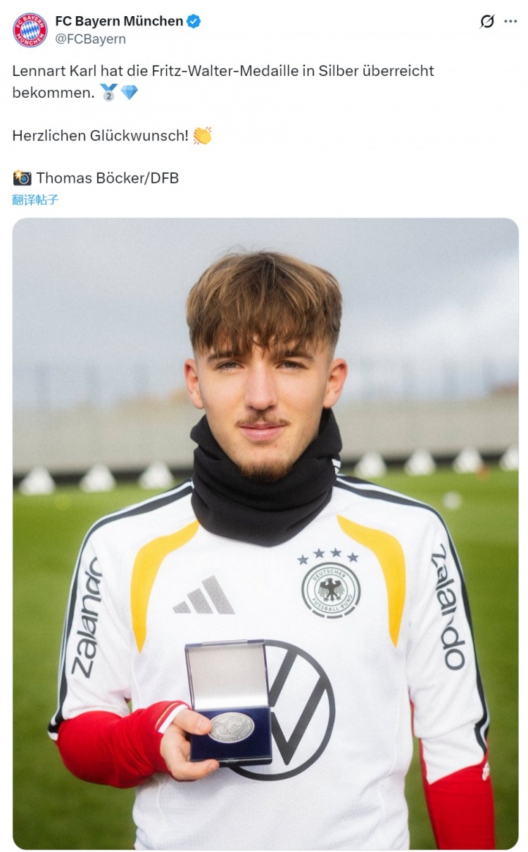 卡尔得到德国足协颁发的弗里茨·瓦尔特银质奖章,拜仁官方社媒晒出这位小将展示奖章的像片,对他暗示祝福。