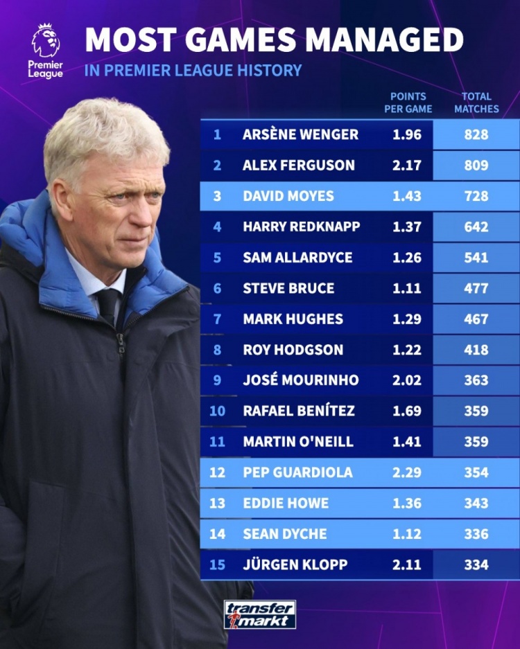 11月26日讯 德国转会市集统计了英超主帅捏教场次排行,莫耶斯728场排行第三,有望追逐弗格森和温格。