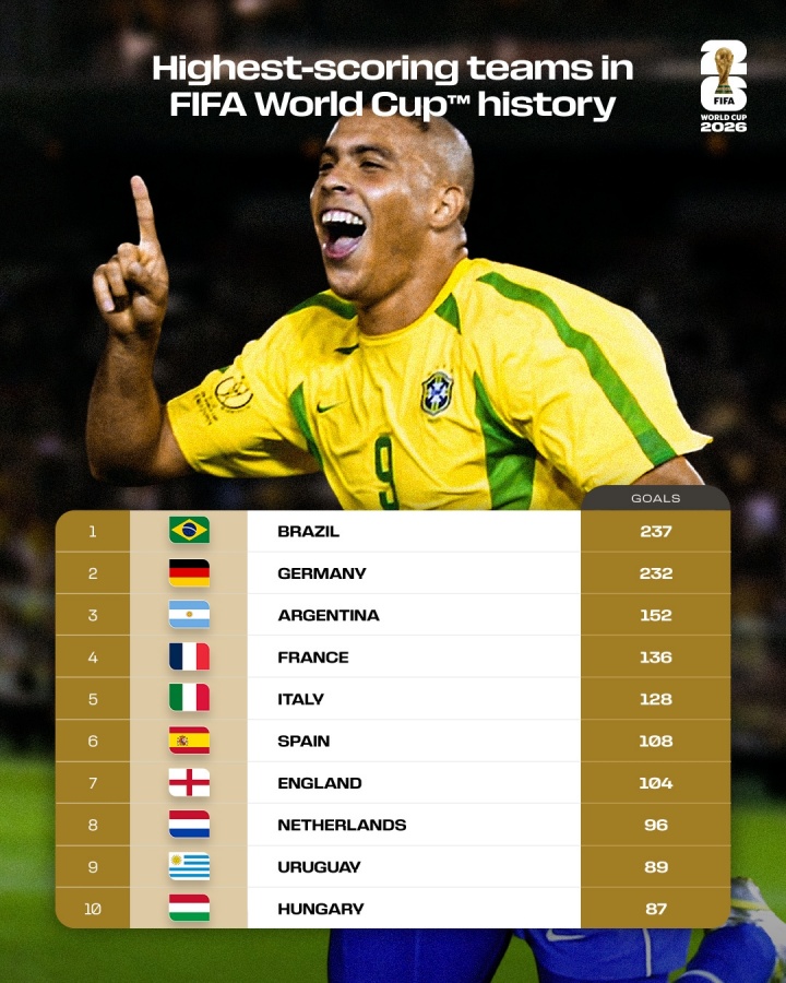 榜单上,巴西237球居首,德国232球紧随自后,巴德断档前二,阿根廷152球第3,法国136球第4,意大利128球第5,西班牙、英格兰、荷兰、乌拉圭、匈牙利前10。